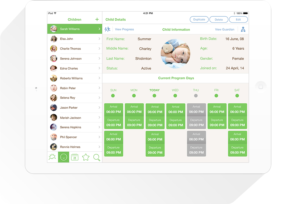 Child profiles are the first step of the documenting process. In here you can adjust everything from contact details to attendance times.